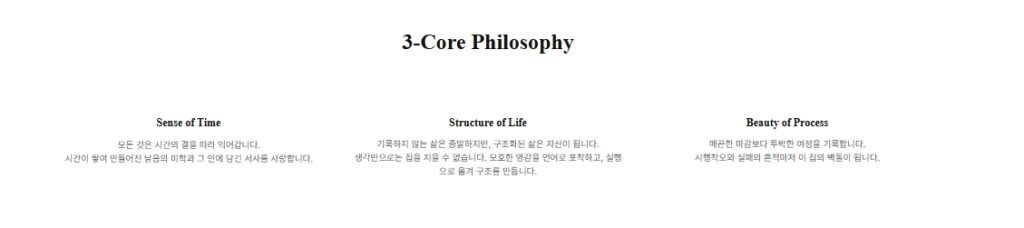 나 또한 이곳이 세상의 풍파 속에서도 흔들리지 않고 직립할 수 있길 바란다. ‘ABOUT – PROJECTS – WORKS – LIBRARY – PROPOSAL’로 이어지는 5개의 척추뼈(GNB)는 방문자에게 명확한 방향을 제시하는 이정표이자, 나라는 브랜드가 무너지지 않게 지탱하는 중력의 중심이다..