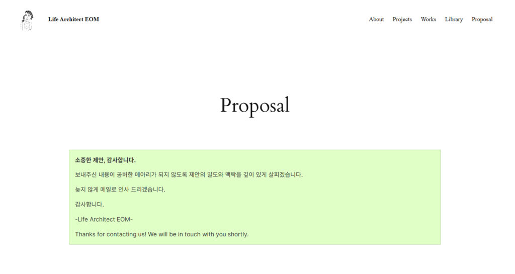 오른손이 악수를 건넨다면, 왼손은 일하고 대가를 받는다. 나는 워드프레스 플러그인(WPForms)을 사용해 ‘제안서폼’ 이라는 강력한 오른손을 [PROPOSAL] 버튼에 심었다. 클라이언트가 프로젝트 내용, 예산을 입력하면, 그 내용은 즉시 비즈니스 메일로 전달된다. 제안서 화면에도 잘 정돈된 Confirmation Message를 띄워 신뢰를 확보한다. 이 손의 악력은 정교하다. 아무거나 닥치는 대로 잡기보다 나에게 맞는 기회만 선별해 움켜쥔다.