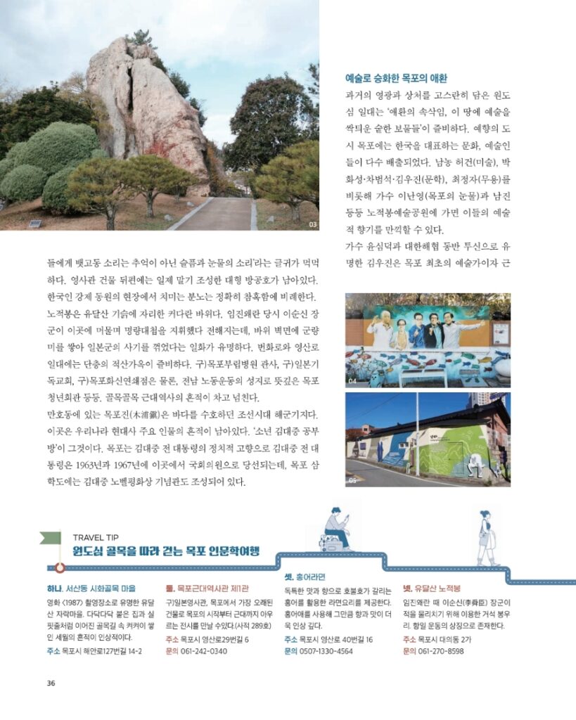 과거의 영광과 상처를 고스란히 담은 원도심 일대는 ‘애환의 속삭임, 이 땅에 예술을 싹틔운 숱한 보물들’이 즐비하다. 예향의 도시 목포에는 한국을 대표하는 문화, 예술인들이 다수 배출되었다. 남농 허건(미술), 박화성⋅차범석⋅김우진(문학), 최정자(무용)를 비롯해 가수 이난영(목포의 눈물)과 남진 등등. 노적봉예술공원에 가면 이들의 예술적 향기를 만끽할 수 있다.