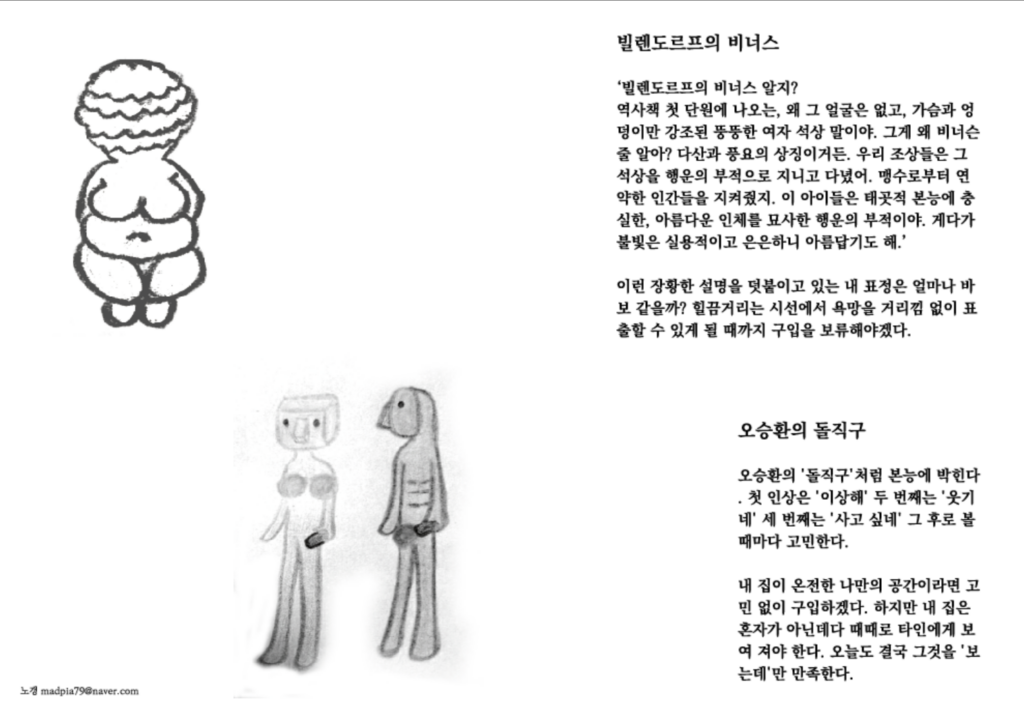 조명 가게에 놓인 뚱뚱한 여인상. 에디터는 역사책에서 본 ‘빌렌도르프의 비너스’를 떠올린다. 얼굴은 없고 가슴과 엉덩이만 강조된 여자 석상, 그것은 다산과 풍요의 상징이자 맹수로부터 인간을 지켜주는 부적이었다. “힐끔거리는 시선에서 욕망을 거리낌 없이 표출할 수 있게 될 때까지 구입을 보류해야겠다.” 욕망을 인정하되 드러내지 못하는 현대인의 이중성을 사물에 투영한 시선이 흥미롭다. 선사시대의 본능과 현대의 억압 사이에서 머뭇거리는 에디터의 솔직함이 묻어난다.